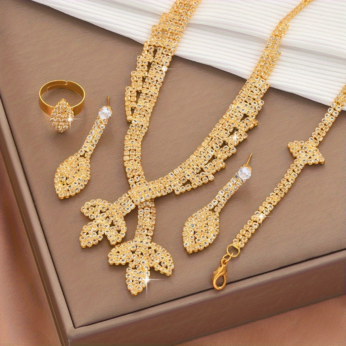 18K Gold Plated Luxury Bridal Jewelry Set - Elegant Zircon Mosaic Copper Necklace, Earrings, Ring, and Bracelet Ensemble for Wedding and Gift-Giving Occasions