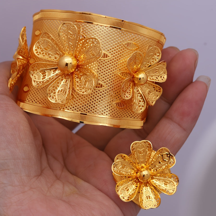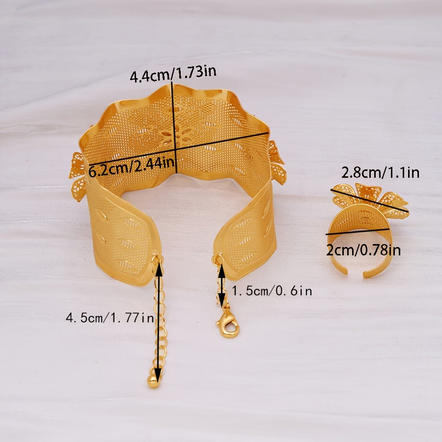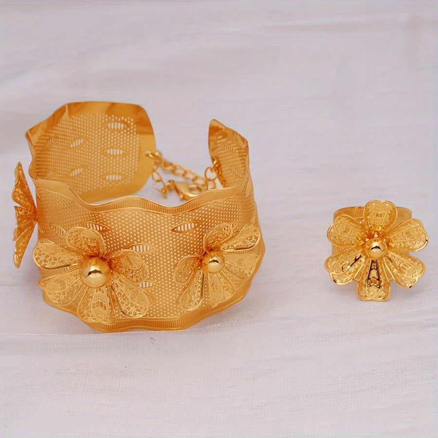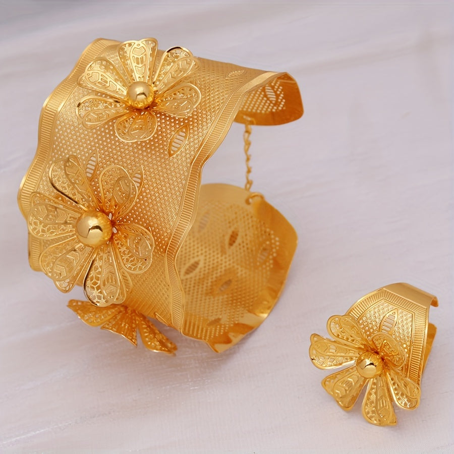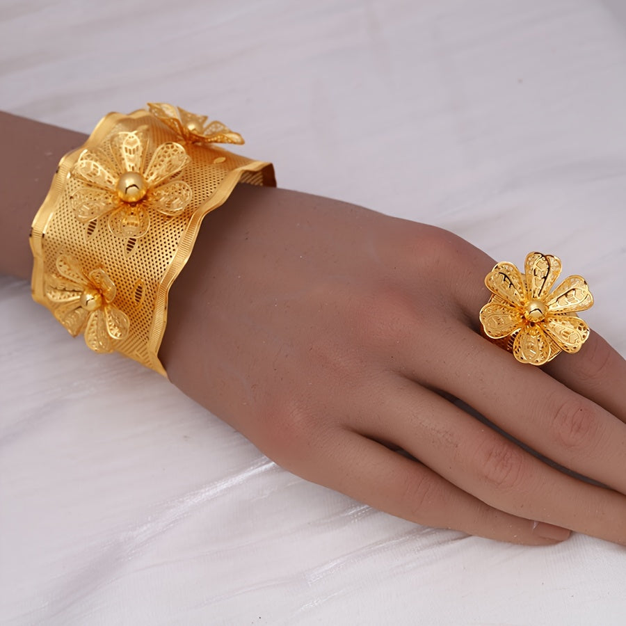 24K Gold Plated Copper Jewelry Set for Women - Sexy Simple Style Open Cuff Bracelet and Ring Set with Petal Design - Daily & Vacation Wear, Perfect for Mother's Day Gift - Middle Eastern, Dubai, African Inspired, No Stone Insets (2-Piece Set)