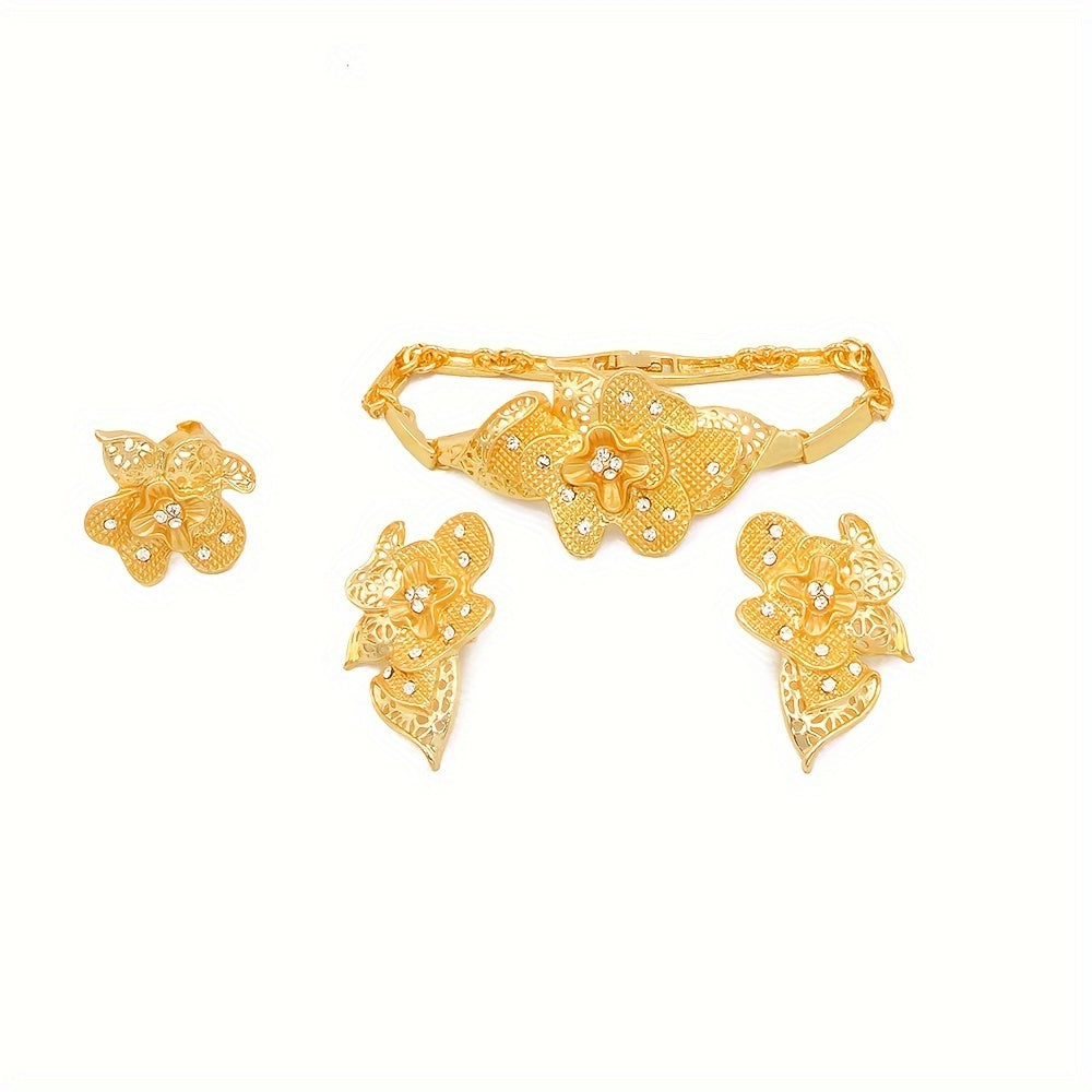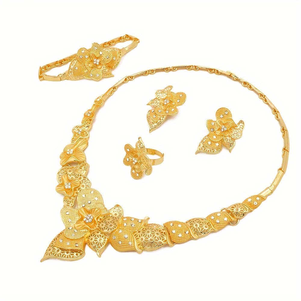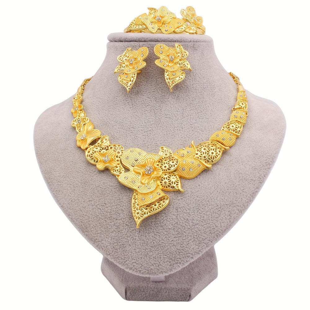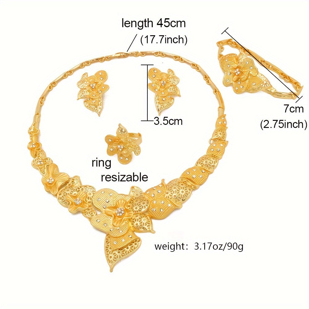 4-Piece Set 24K Gold Plated Jewelry Set, Ethnic & Luxurious Style, Middle Eastern Dubai Wedding Jewelry for Women, African Bridal Necklace, Bracelet, Earrings, Ring Set GIfts For Eid