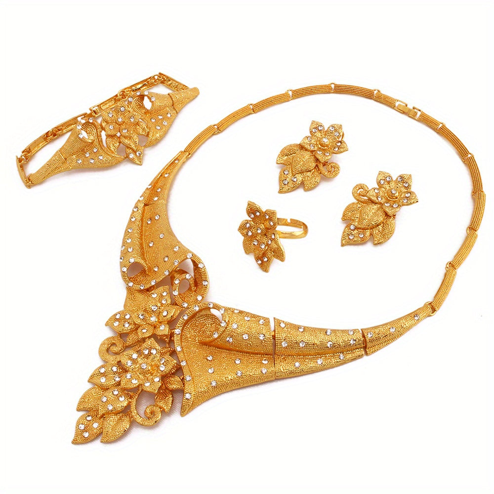 5-Piece Traditional Bridal Jewelry Set - 24K, Paved Shining Zirconia, Flower Design, Matching Earrings, Necklace, Bracelet, and Ring for Daily Outfits and Special Occasions