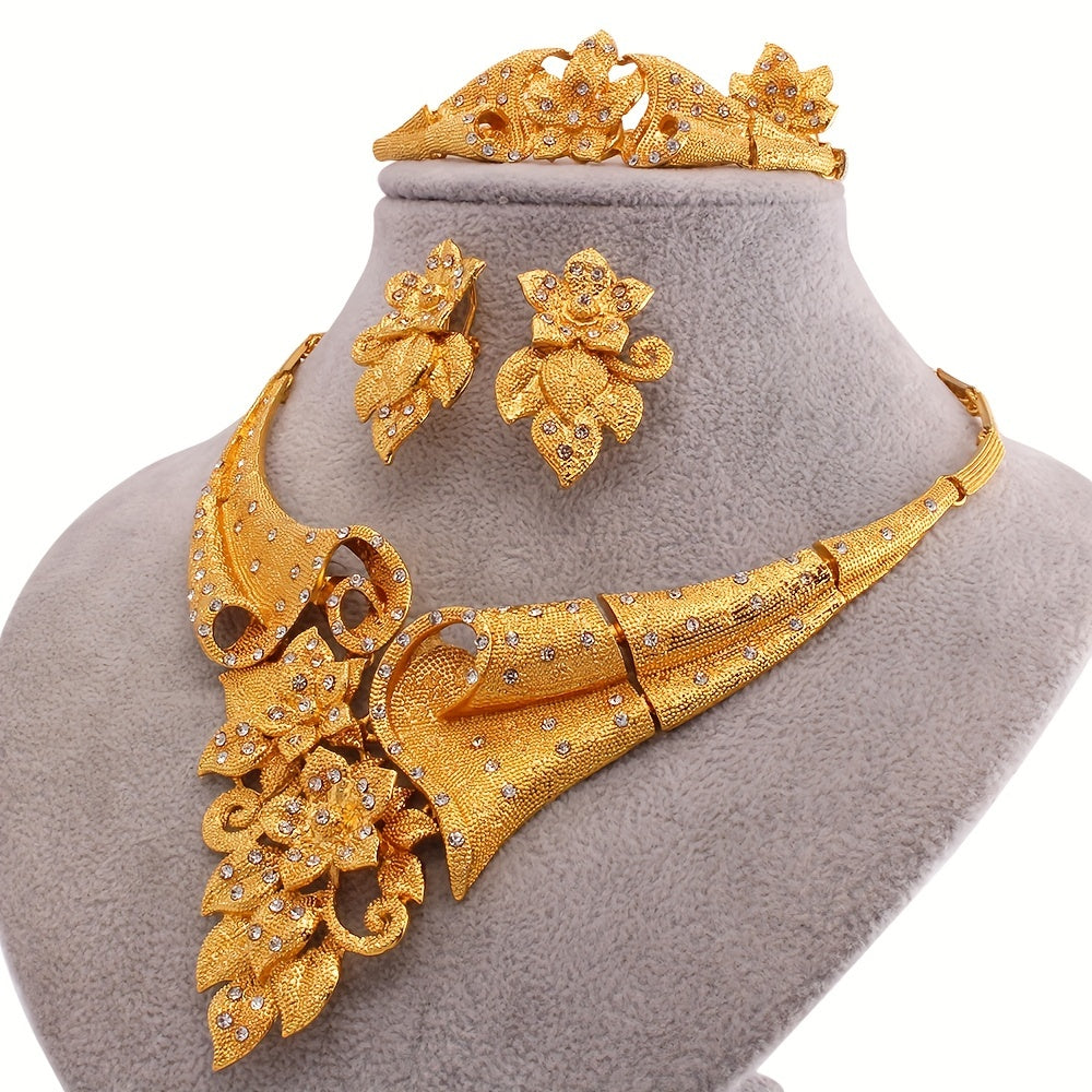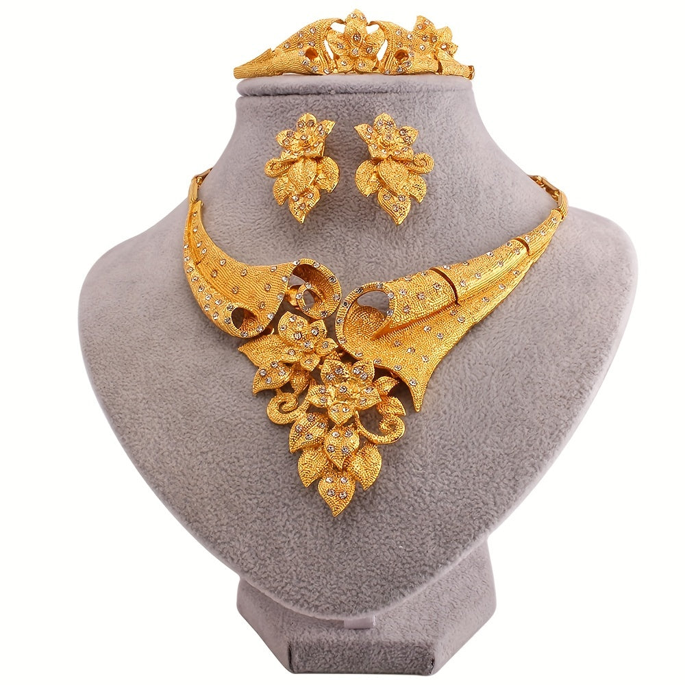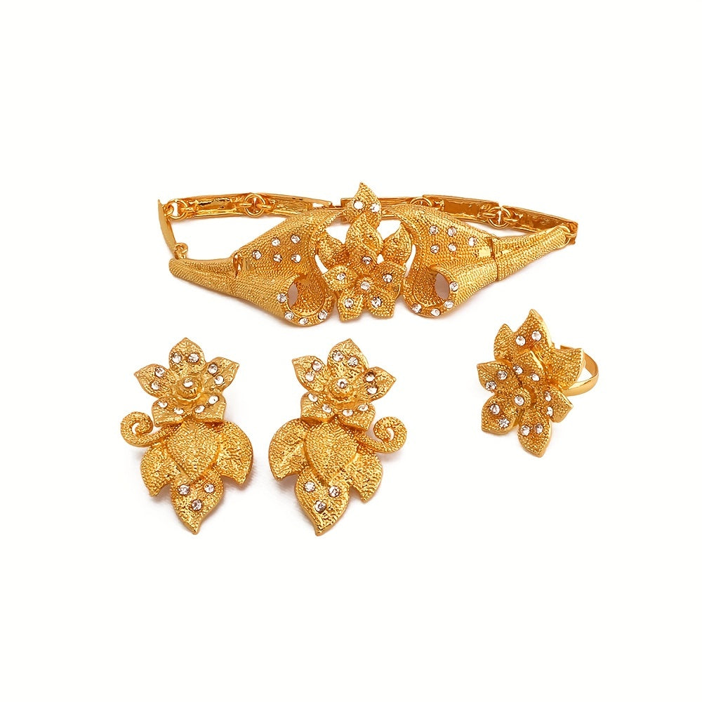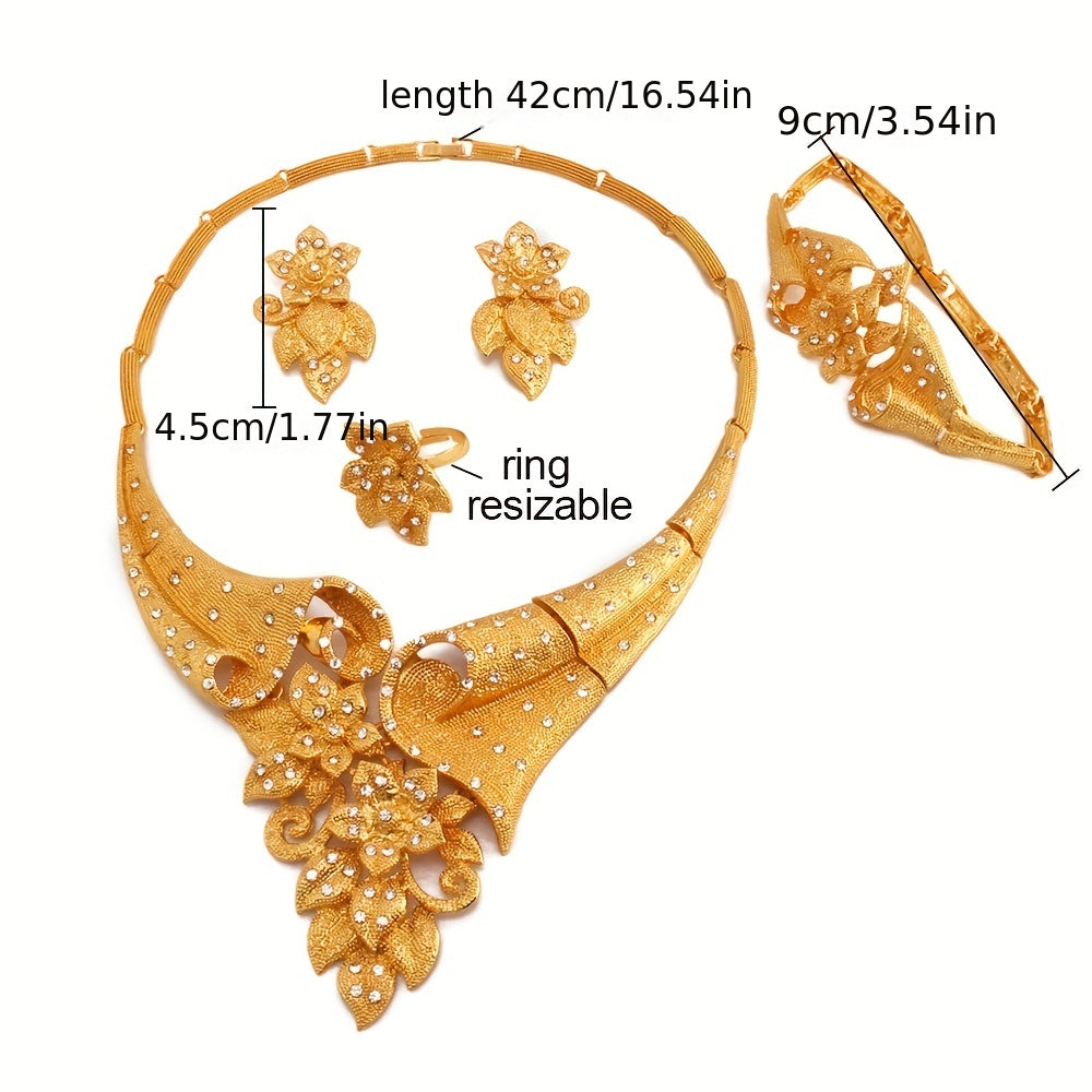 5-Piece Traditional Bridal Jewelry Set - 24K Plated, Paved Shining Zirconia, Flower Design, Matching Earrings, Necklace, Bracelet, and Ring for Daily Outfits and Special Occasions