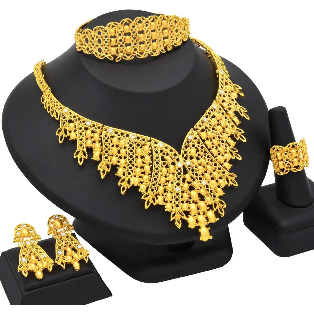 Yo, fashion kings and queens! Ready to slay every event with that drop-dead gorgeous vibe? Dive into the glam world with this epic 5PCS 24K Gold-Plated Indian Bollywood Jewelry Set. This set isn't just jewelry; it's a statement-maker for those who love to blend tradition with modern radness. From casual hangouts to glam parties, this set will have you shining like the true diva you are. Sporting a stunning jhumka style, this set serves major ethnic goals while keeping your look effortlessly lit. Trust us, your fit pics are gonna blow up Instagram with these stunners.
