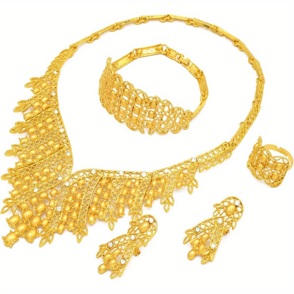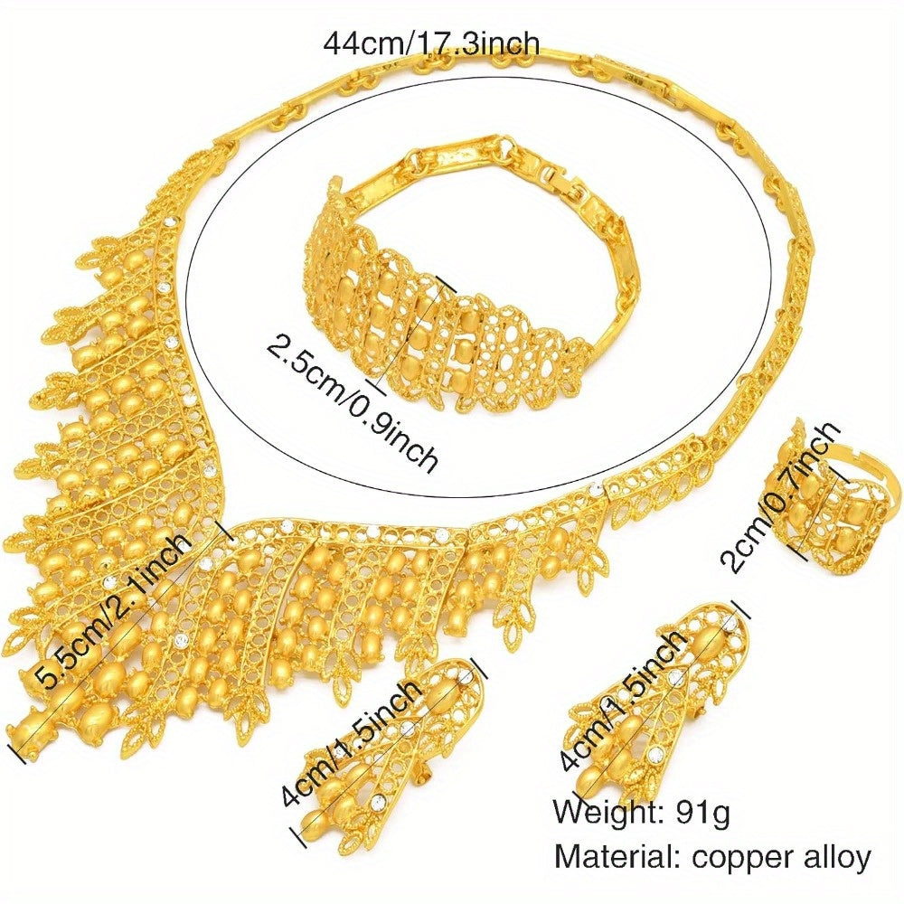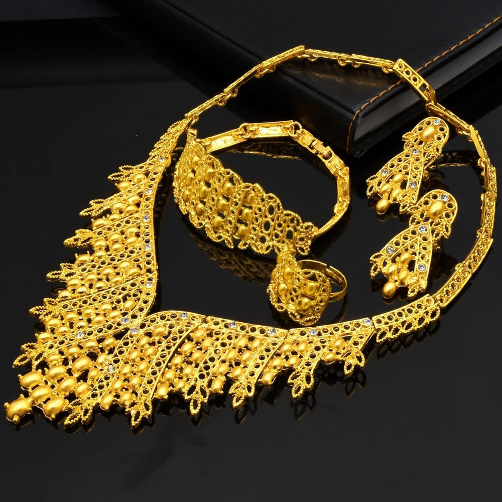 Crafted with top-notch copper alloy and polished with 24K gold, these pieces bring the dazzle without breaking the bank. Whether it's varsity parties, chill summer days, or fam festive nights, this set is your go-to. And don't even get us started on the compliments—you're bound to collect them like Pokémon. So, why wear basic when you can be boujee and make heads turn? Gear up, glam up, and treat yourself to this fab treasure trove of bling!