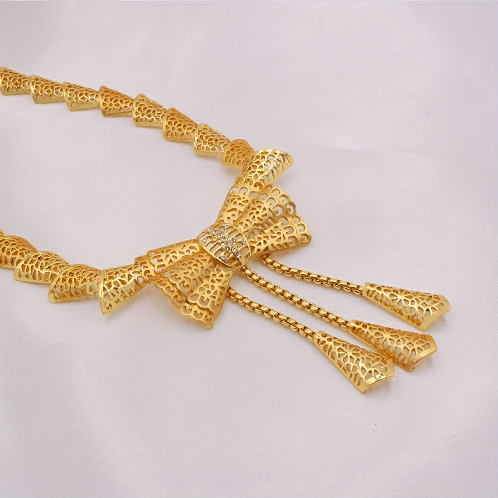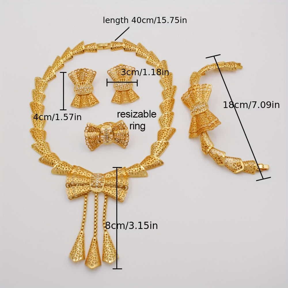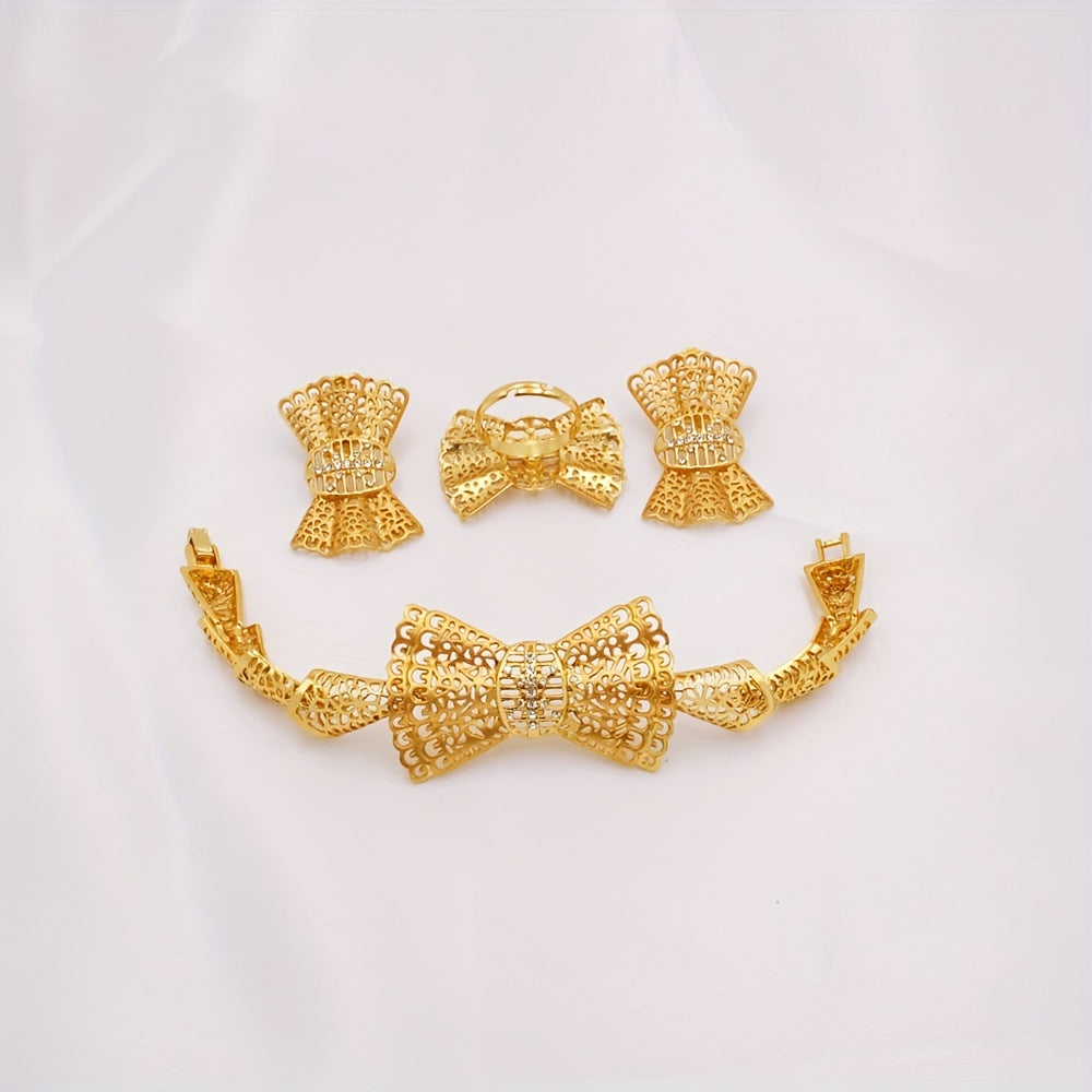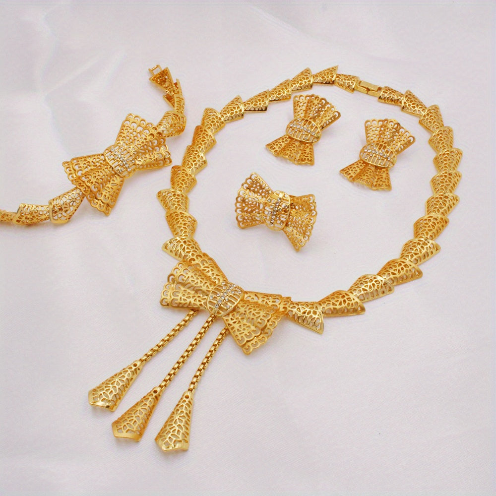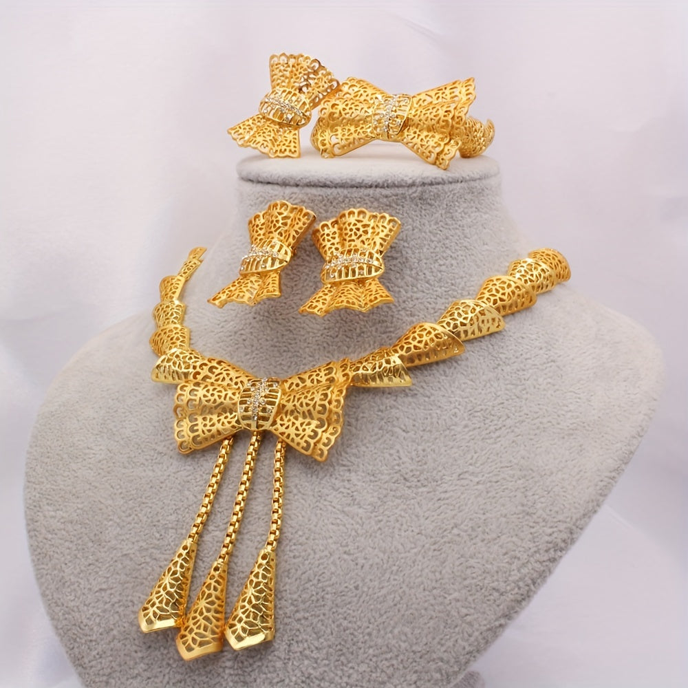 5pcs Earrings + Necklace + Bracelet + Ring Traditional Bridal Jewelry Set 24k Gold Plated Retro Golden Bow Knot Design Match Daily Outfits