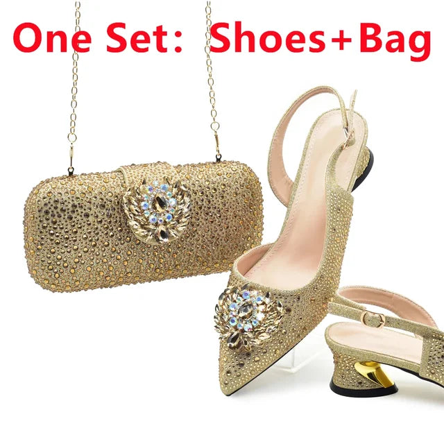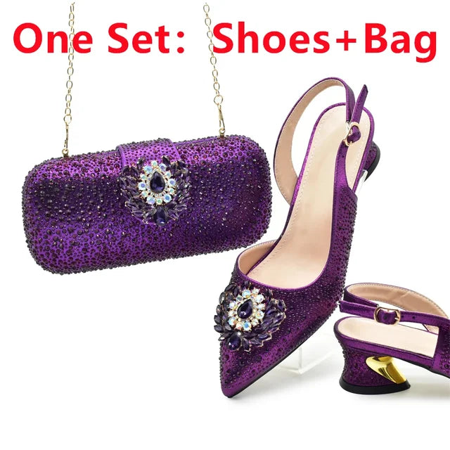 African Shoe and Bag Matching Set 2024 Women Nigerian Italian Shoes and Bags Set Decorated with Rhinestone Rhinestone Pumps