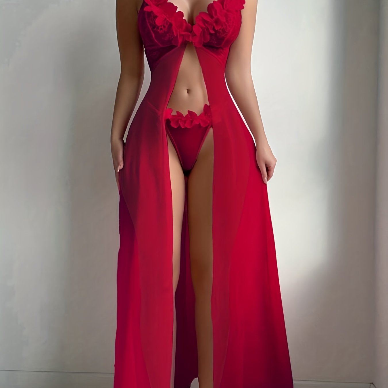 [Floral Lace Lingerie] Women's Seduction Night 3D Floral Lace Lingerie Dress Nightgown Set + Thong, Intimate Apparel, Bedroom Attire, Lace Trim, Feminine Design, Breathable Fabric, Hand Wash Only, Matching Set, Sleepwear Combo, Romantic Wear, Boudoir Outf