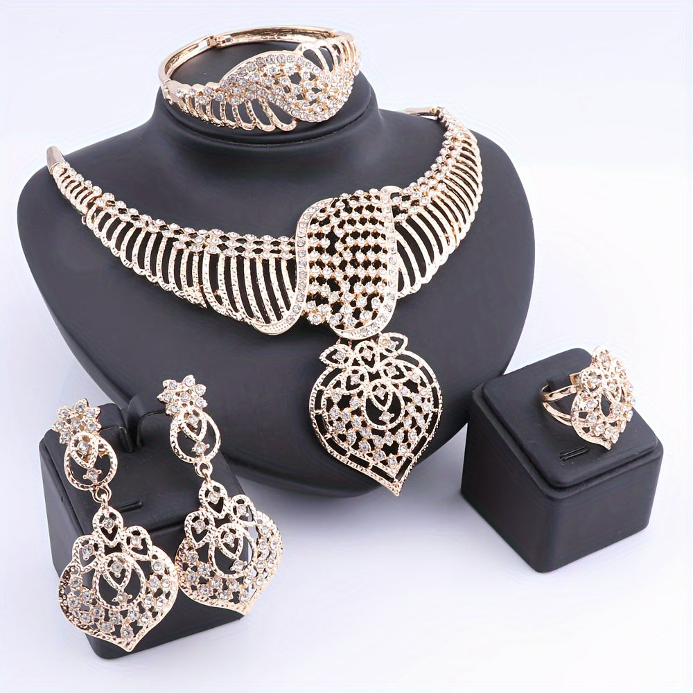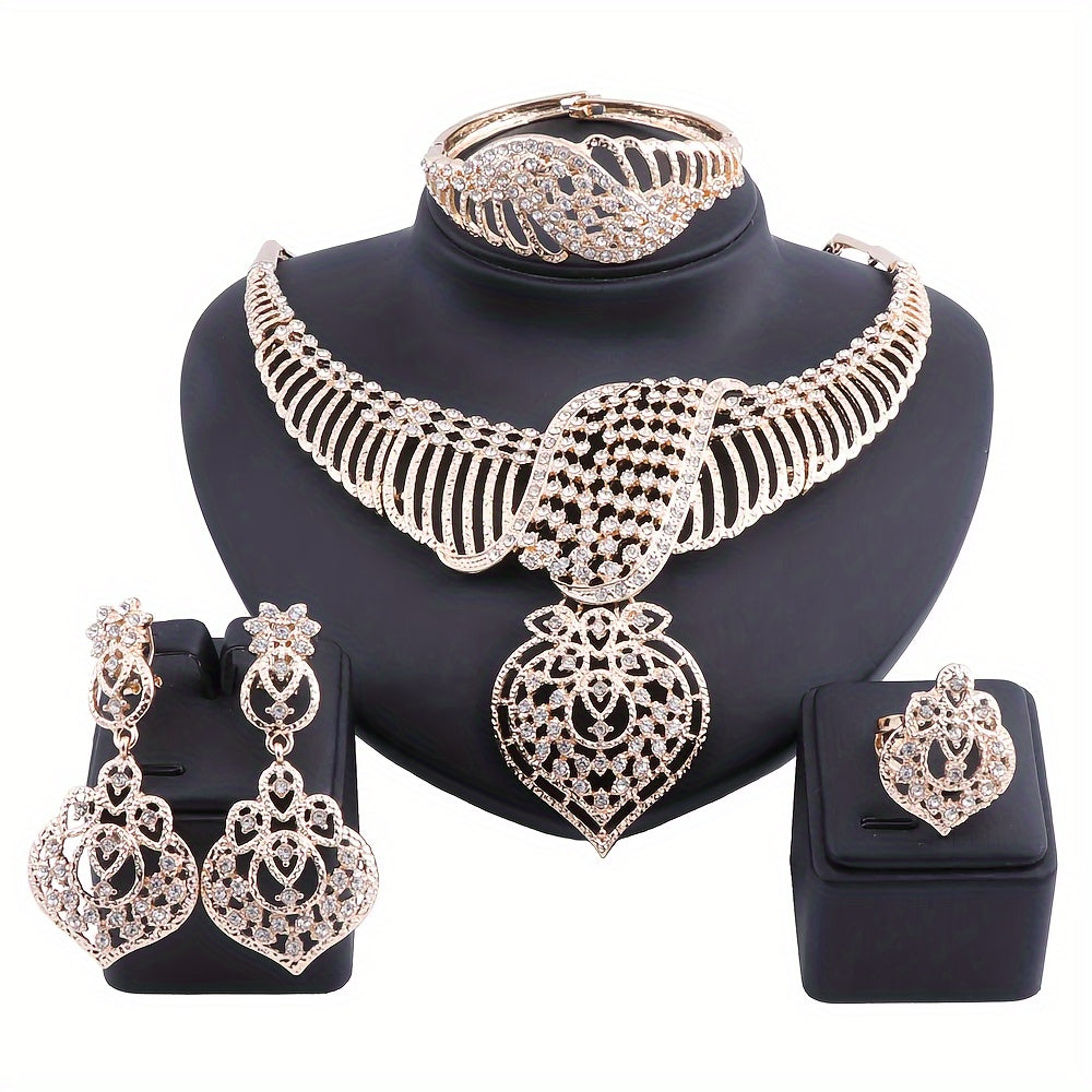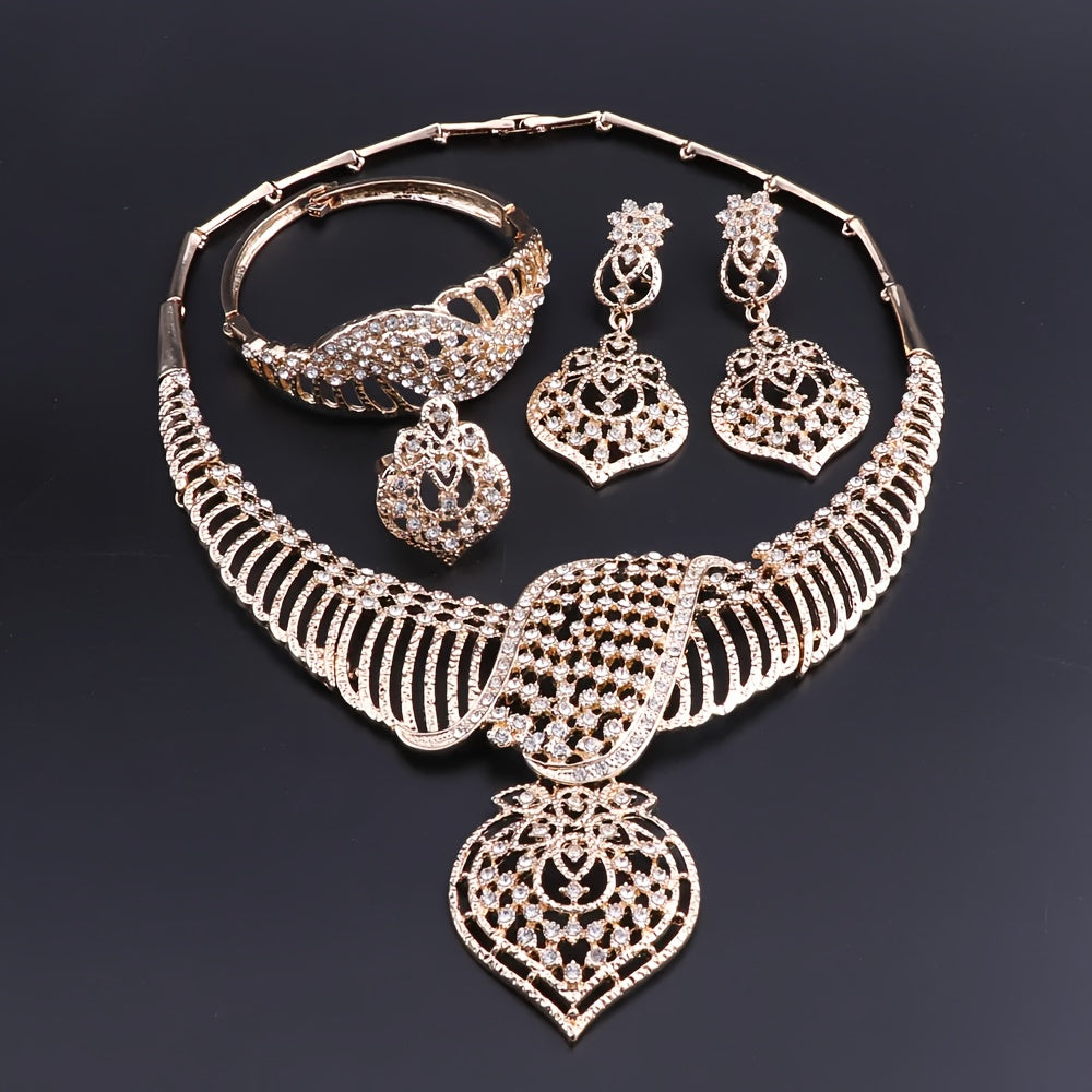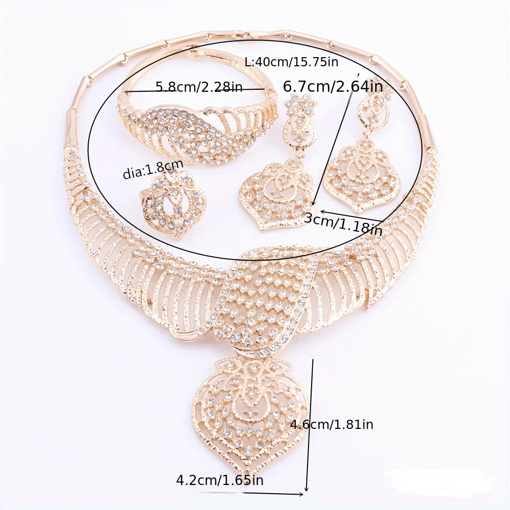 Luxury Gold Plated Crystal Heart-Shaped Pendant Necklace, Earrings, Ring Set, Perfect For Women's Gift, Party, Wedding, And Everyday Wear