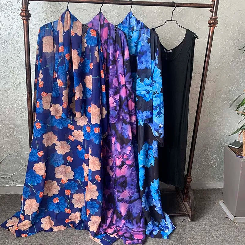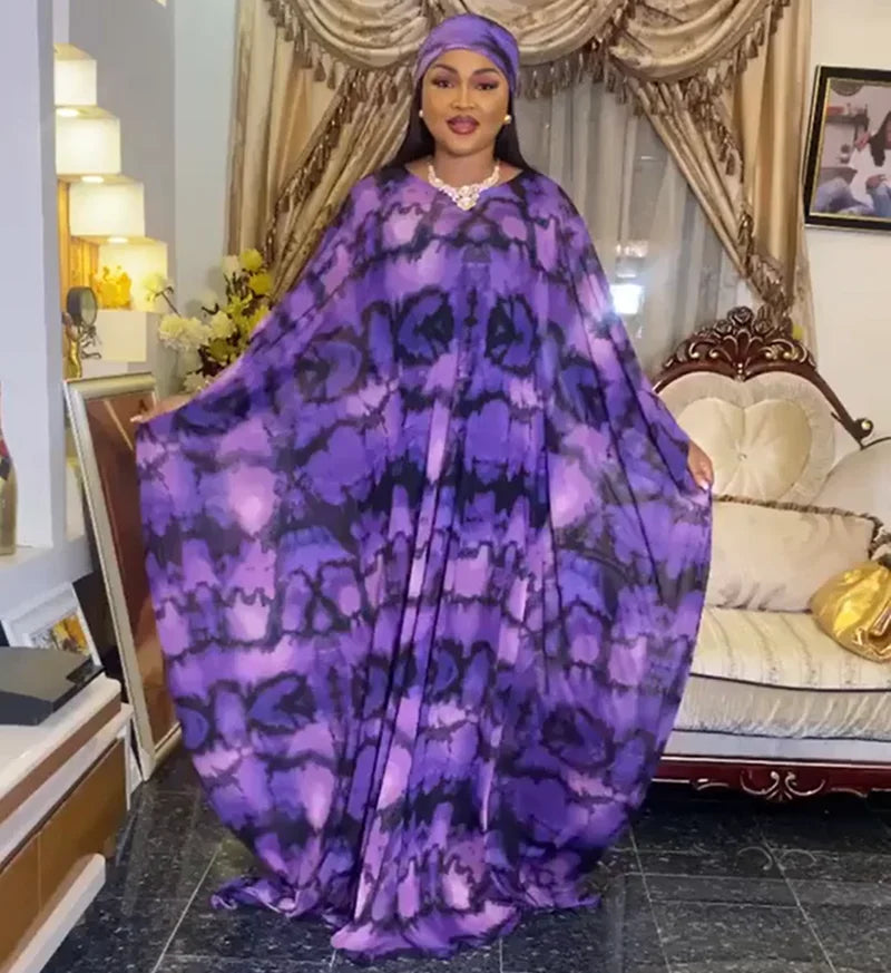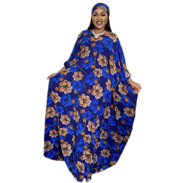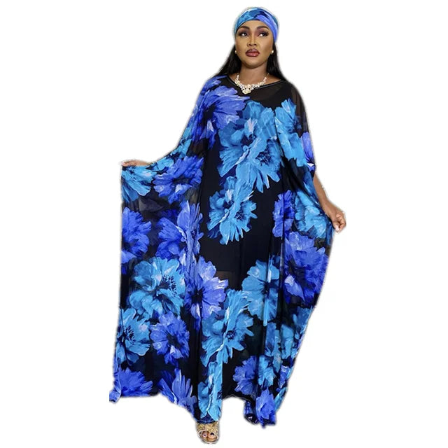 New Fashion African Dashiki Chiffon Free Size Long Dress For Women Summer Print Flower Abaya With Inner And Headtie Scarf Gown