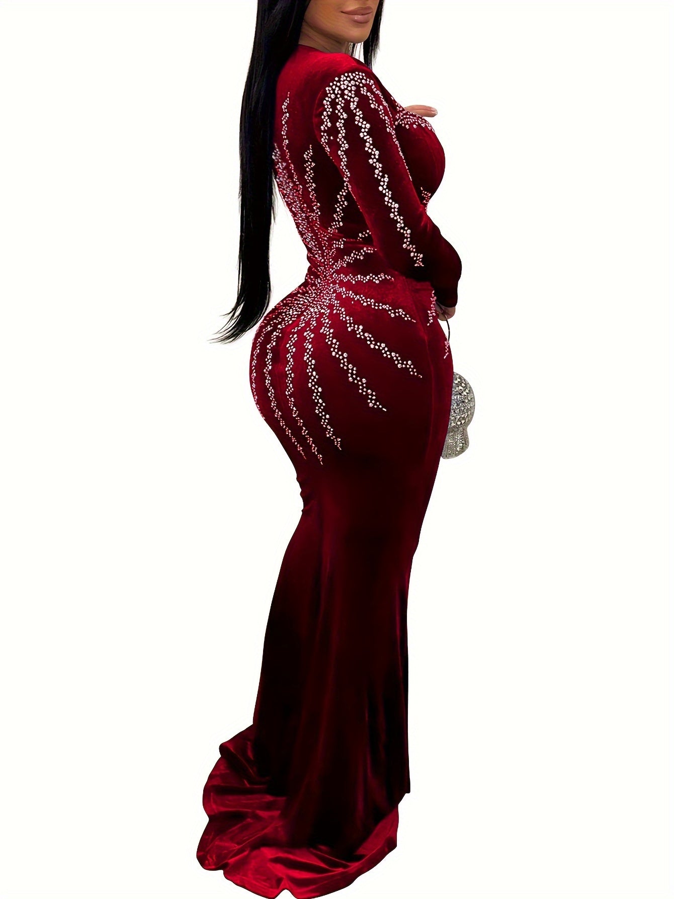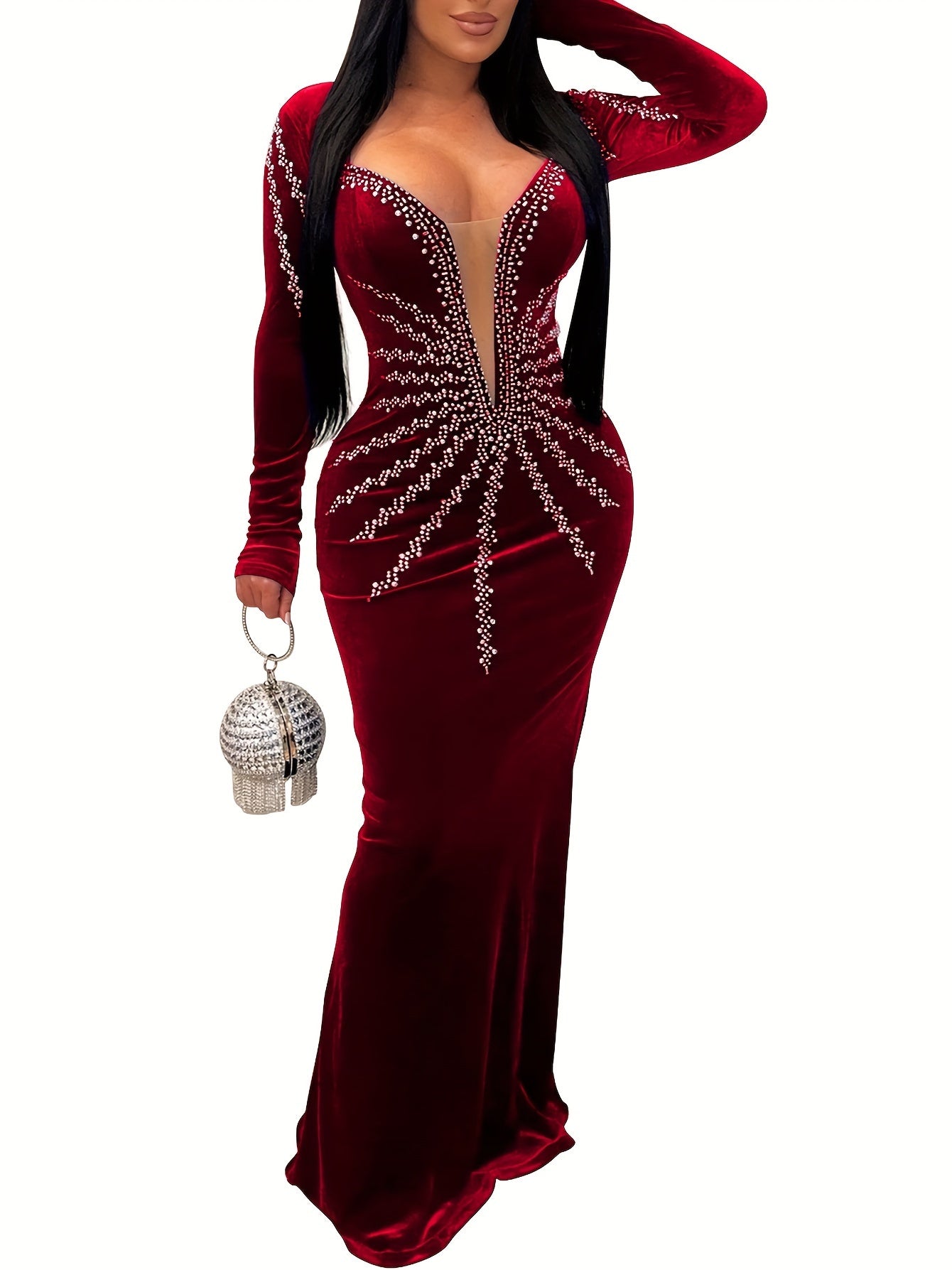 Rhinestone Illusion Neck Cocktail Dress - Elegant, Long Sleeve, Bodycon, Party, Banquet, Wedding, Occasion, Engagement, Ceremony, Evening Wear for Women