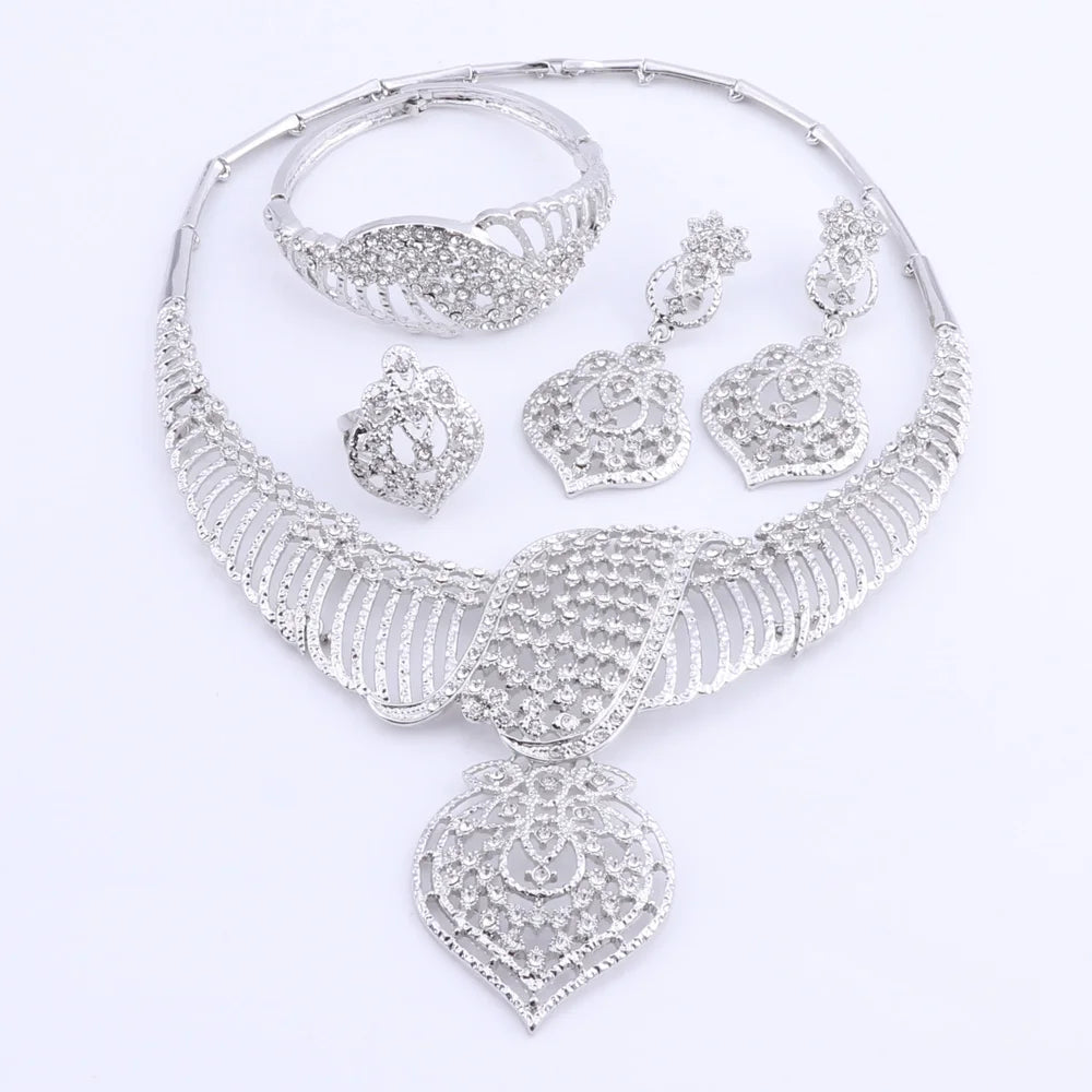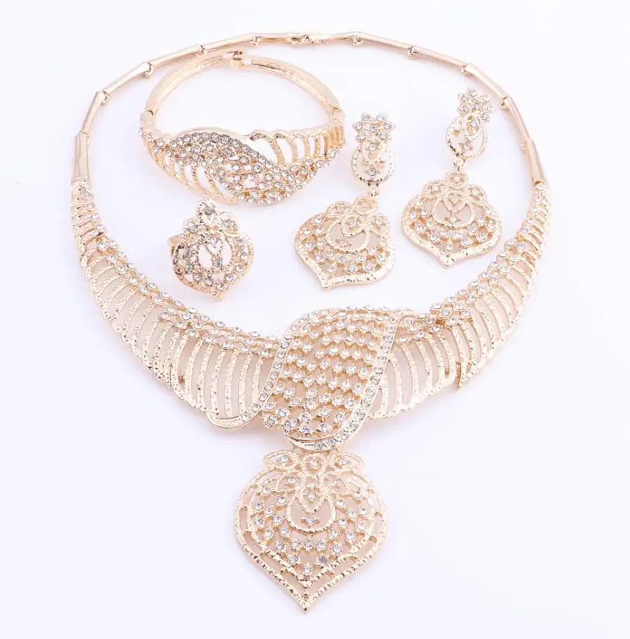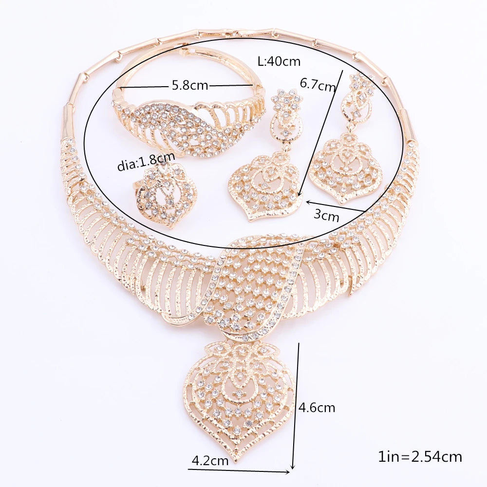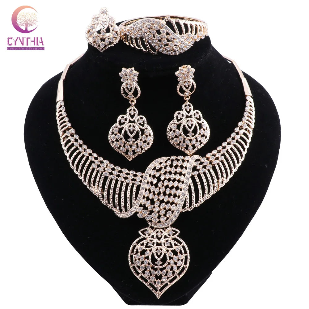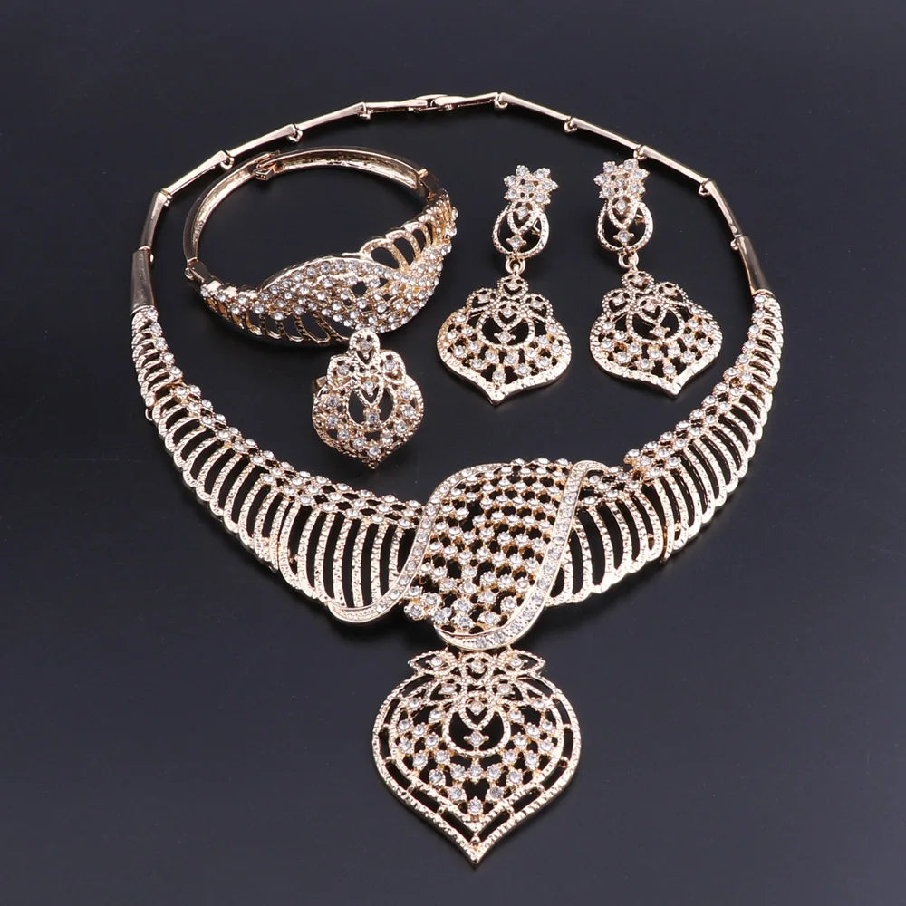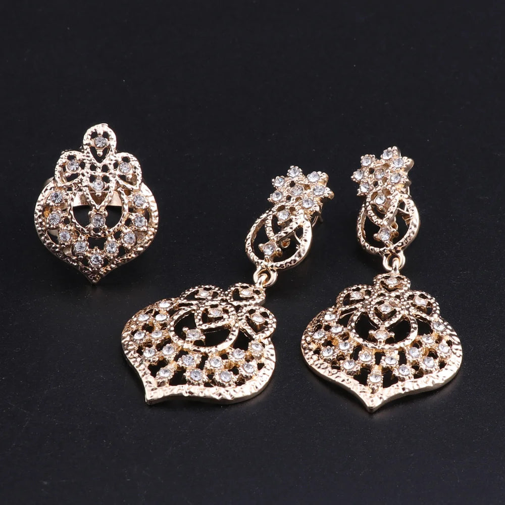 Wedding African Women Trendy Bridal Dubai Gold Color Necklace Bride Crystal Earring Ring Classic Jewelry Set