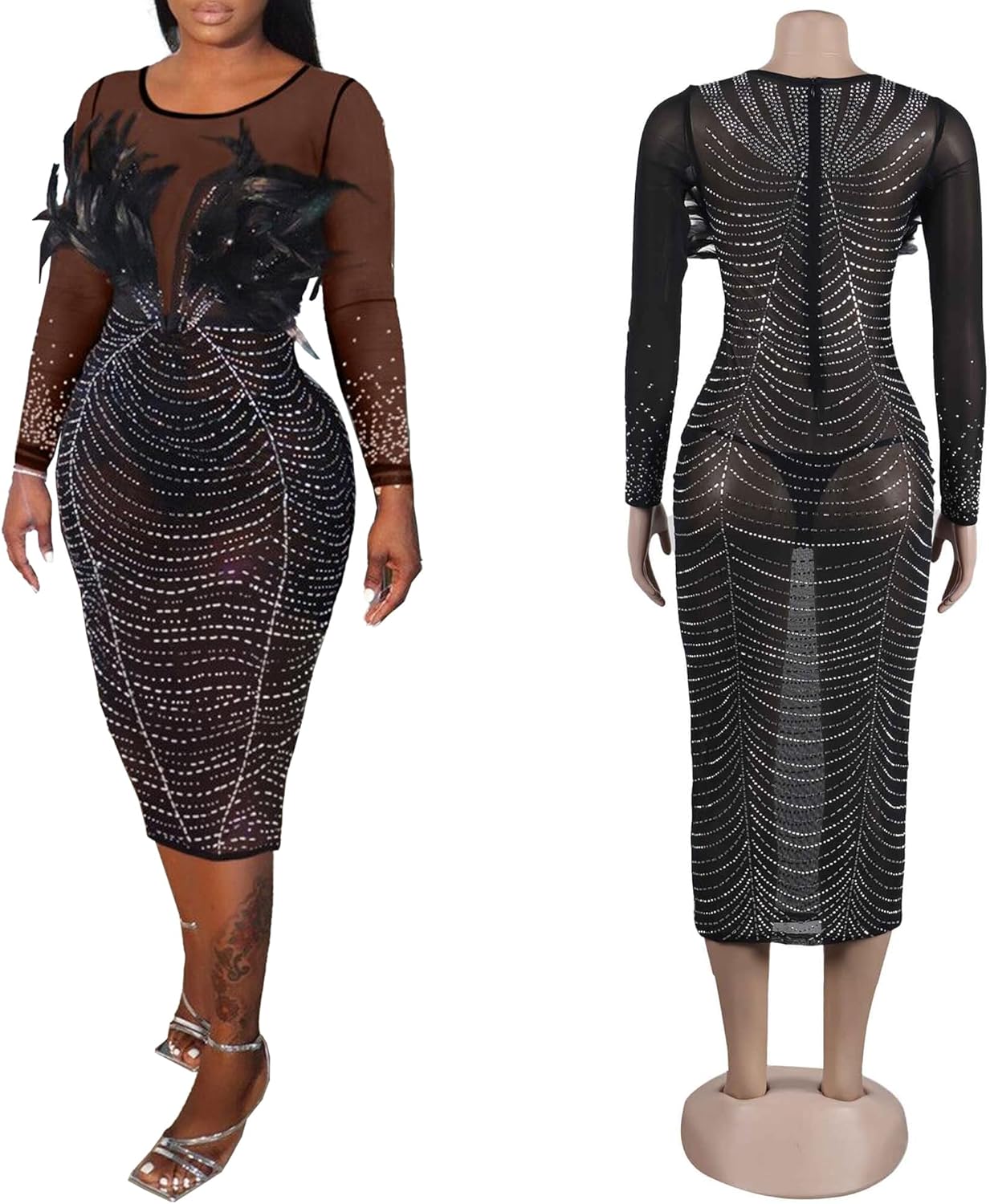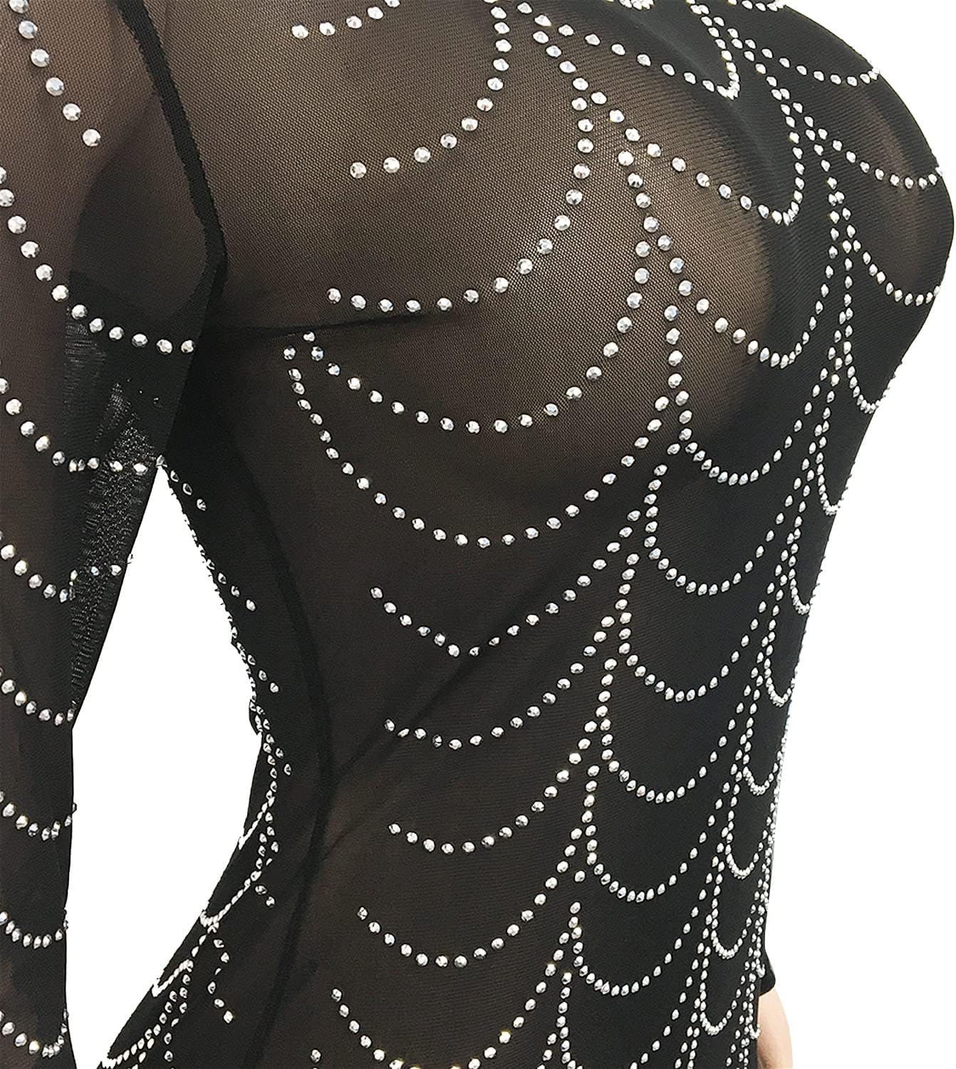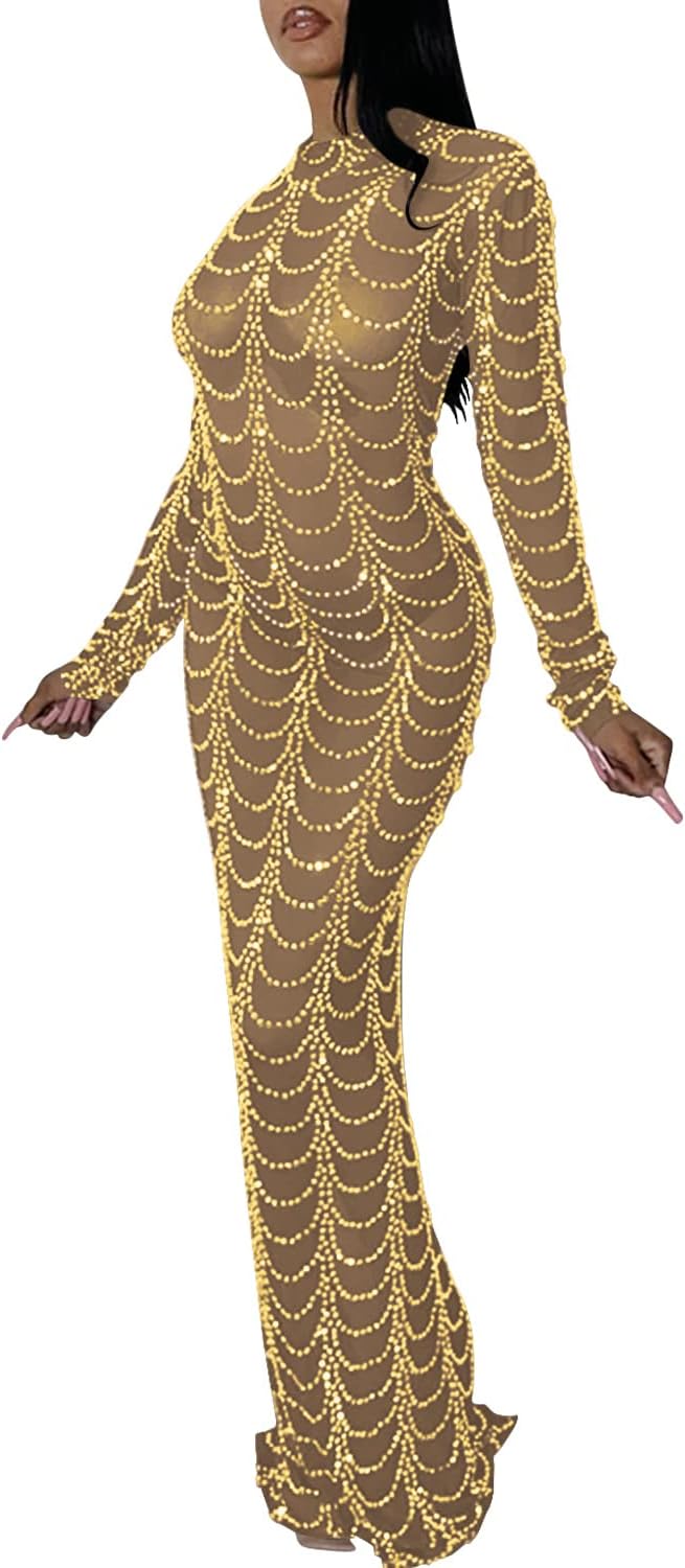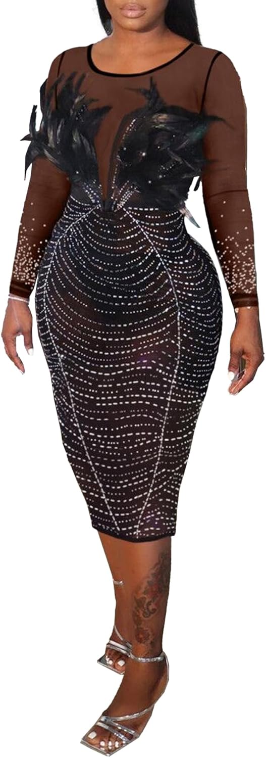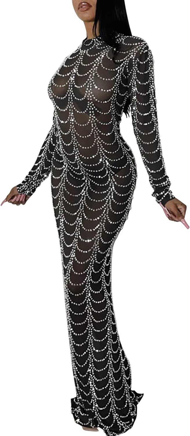 Women Sexy Elegant Rhinestone Mesh See Through Bodycon Party Club Night Out Dress