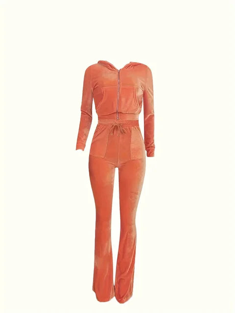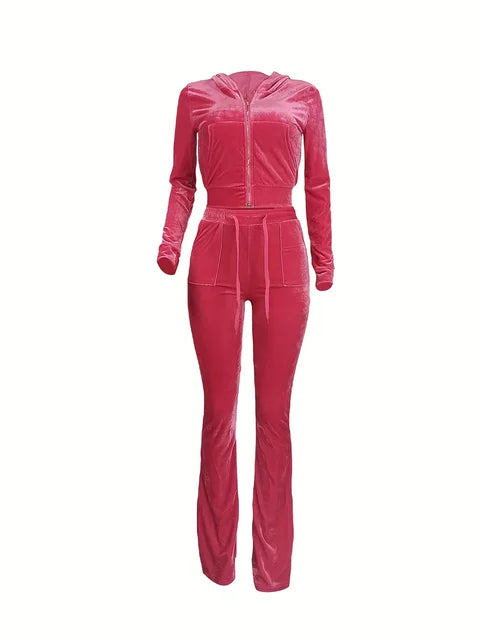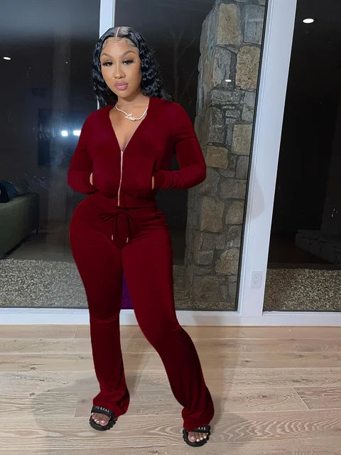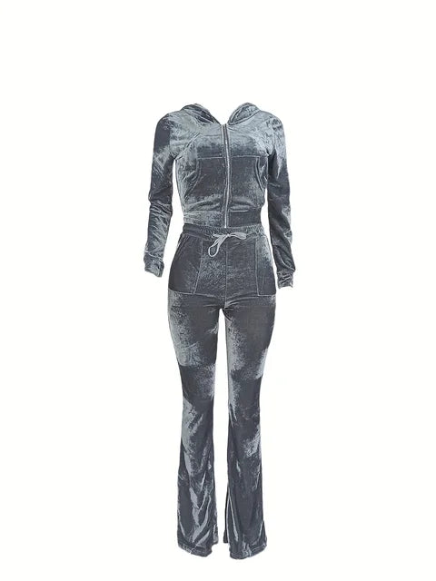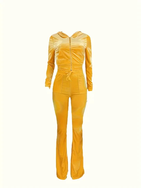 Women Velvet Two Piece Set Autumn Winter Tracksuit Outfits Long Sleeve Hooded Zipper Sweatshirt Drawstring Wide Leg Pants Suit