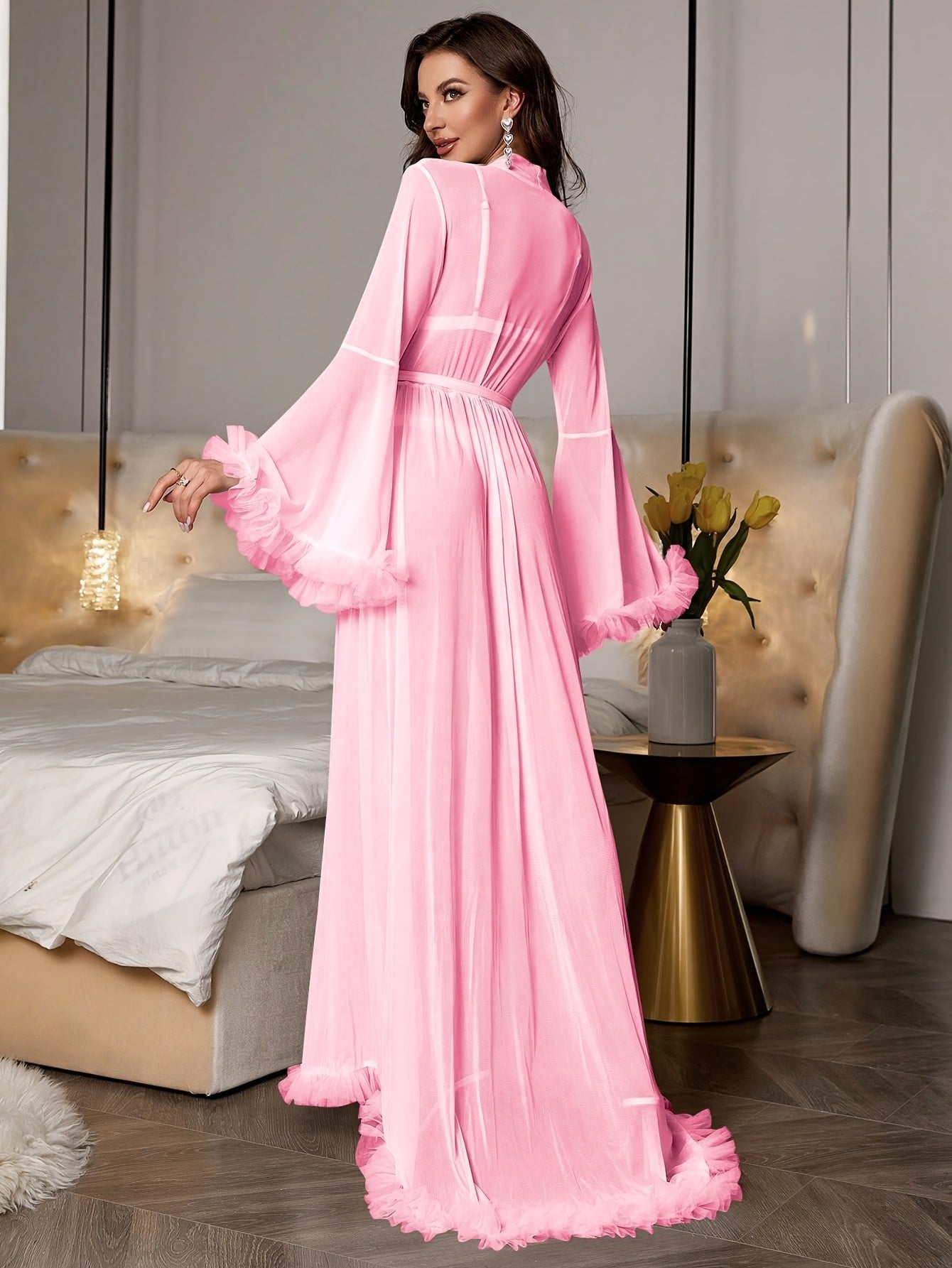 Women's Elegant - Pink Plush - Lace Trim Semi-Sheer Nightgown - Long Sleeve Robe with Belt - Full-Length Dress Sleepwear for Bed & Lounge - Alluring Pajamas (Hand Washable) - Soft Lingerie for s