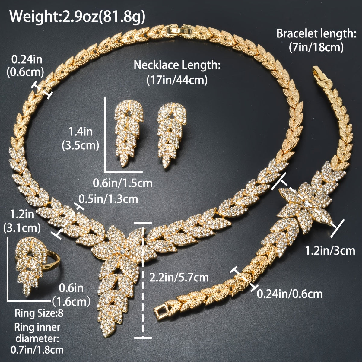 Whether you're rockin' a casual outfit or stepping out for a special occasion, this versatile jewelry set will elevate your style game. Each piece—necklace, bracelet, ring, and earrings—is designed to be show-stopping yet timeless. And let's be real, with the holiday season approaching, who wouldn't want to flex this stunning accessory set?